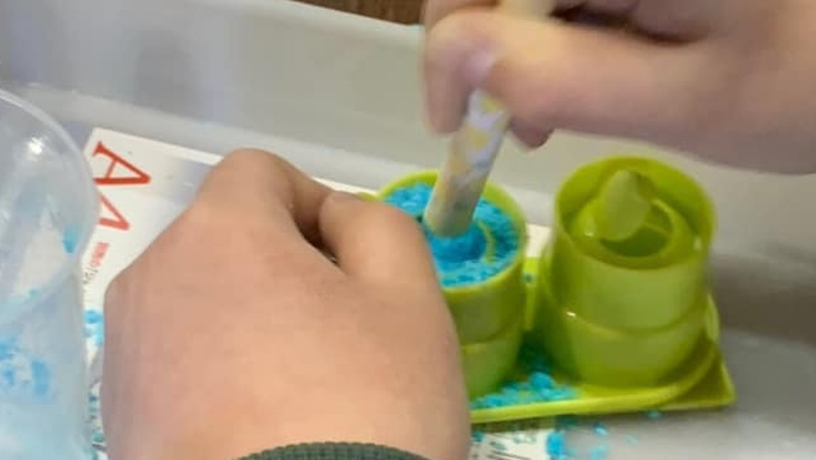 バスボムを作ります。バスボムの香りと色は何種類かあり、こどもたちが自分で選びます。