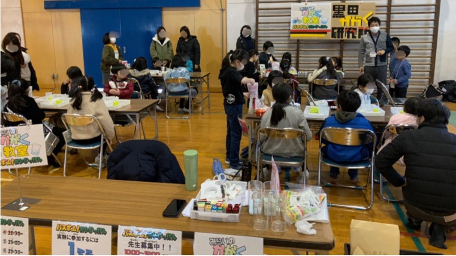 人間がにおいを感じるしくみや、バスボムを水に入れると発泡する仕組みについての講義を聞き、