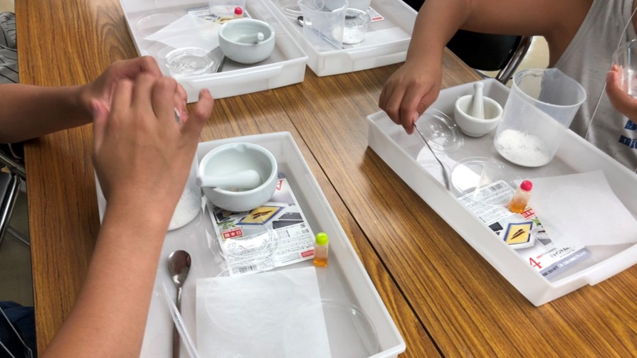 ビーカーの中に作った胃もたれを胃薬で治す実験です。実験器具が沢山出てくるので喜ぶお子さんが多い講座です。胃もたれが治る瞬間は思わずおぉ!と声を上げてしまいます。
