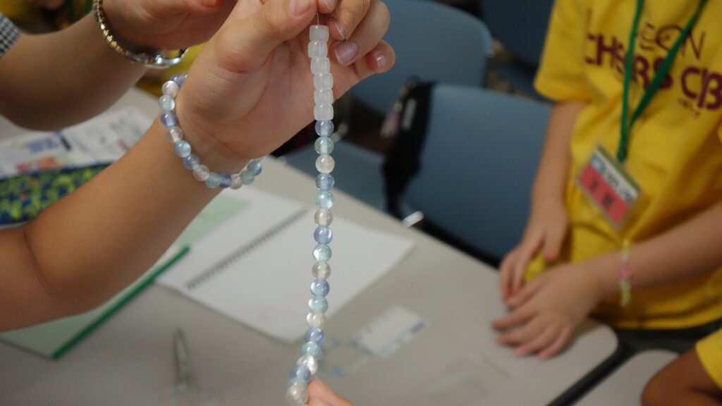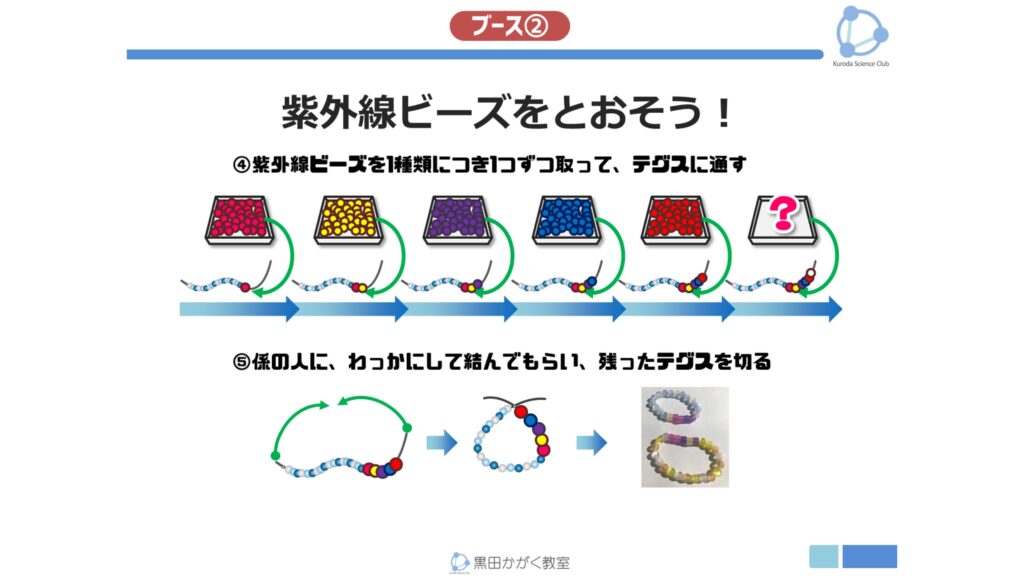紫外線で色が変わる紫外線ビーズを使ってブレスレットを作ります。かわいいブレスレットを持ち帰れるので人気の講座です。