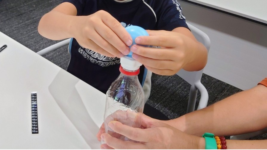 ペットボトルを使った実験でエアコンの仕組みを学ぶ講座です。何回もポンプを押すので楽しい(疲れる?)講座になっています。